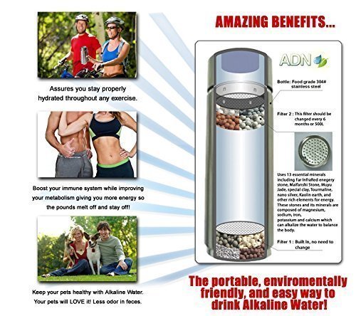 De alkalische waterfles is een gezondheidsproduct dat water filtert en alkalisch (basisch) maakt. De fles is gemaakt van roestvrij staal en bevat twee filters, die met speciaal filtermateriaal het water reinigen en kaliseren. De alkaline waterfles maakt het mogelijk om onderweg water te reinigen en basisch te maken. Het verwisselbare filter moet na ca. 600 liter worden vervangen (kan bij ons nabestellen)