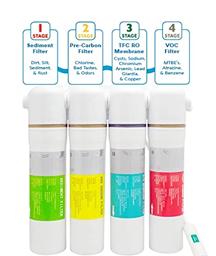 Zuiver PROI-4 Omgekeerd Osmose-systeem gebruikt snelle veranderfilters die de puinhoop en moeilijkheidsgraden worden geassocieerd met filterwijzigingen. Dit ruimtebesparende systeem heeft een compact, undersink-ontwerp en een opslagtank van drie gallon, dus u hebt genoeg water voor dagelijks gebruik.